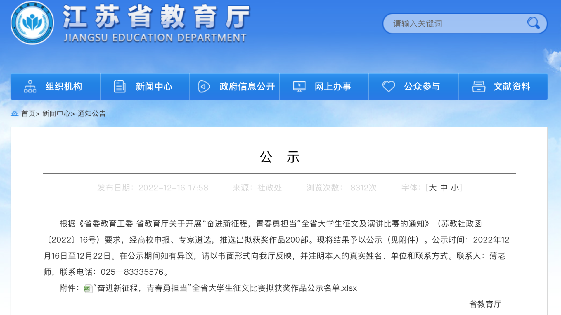 此次大赛以“奋进新征程,青春勇担当”为主题,比赛自10月底启动,历时两个月,全省百余所高校参与。户外露出 收到通知后,高度重视,由团委牵头联合公共教学部与各系,在校内开展了征文选拔比赛,在全部学生参与的基础上,经班级初赛、系部复赛共选拔25篇稿件进入院级决赛,经过在线打分、评议讨论、专家指导等评审环节,选定3篇征文作品代表学校参加江苏省大学生征文比赛。