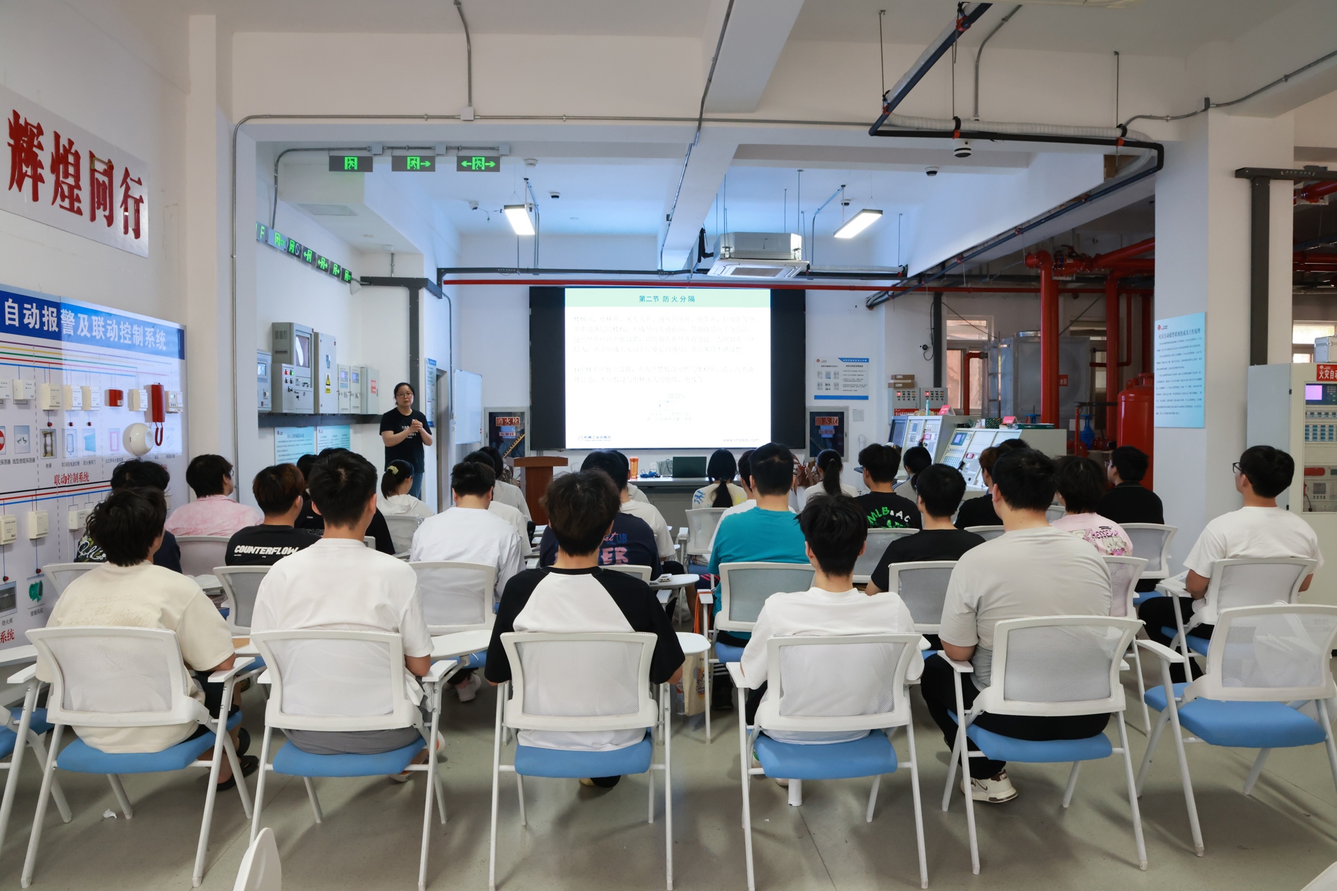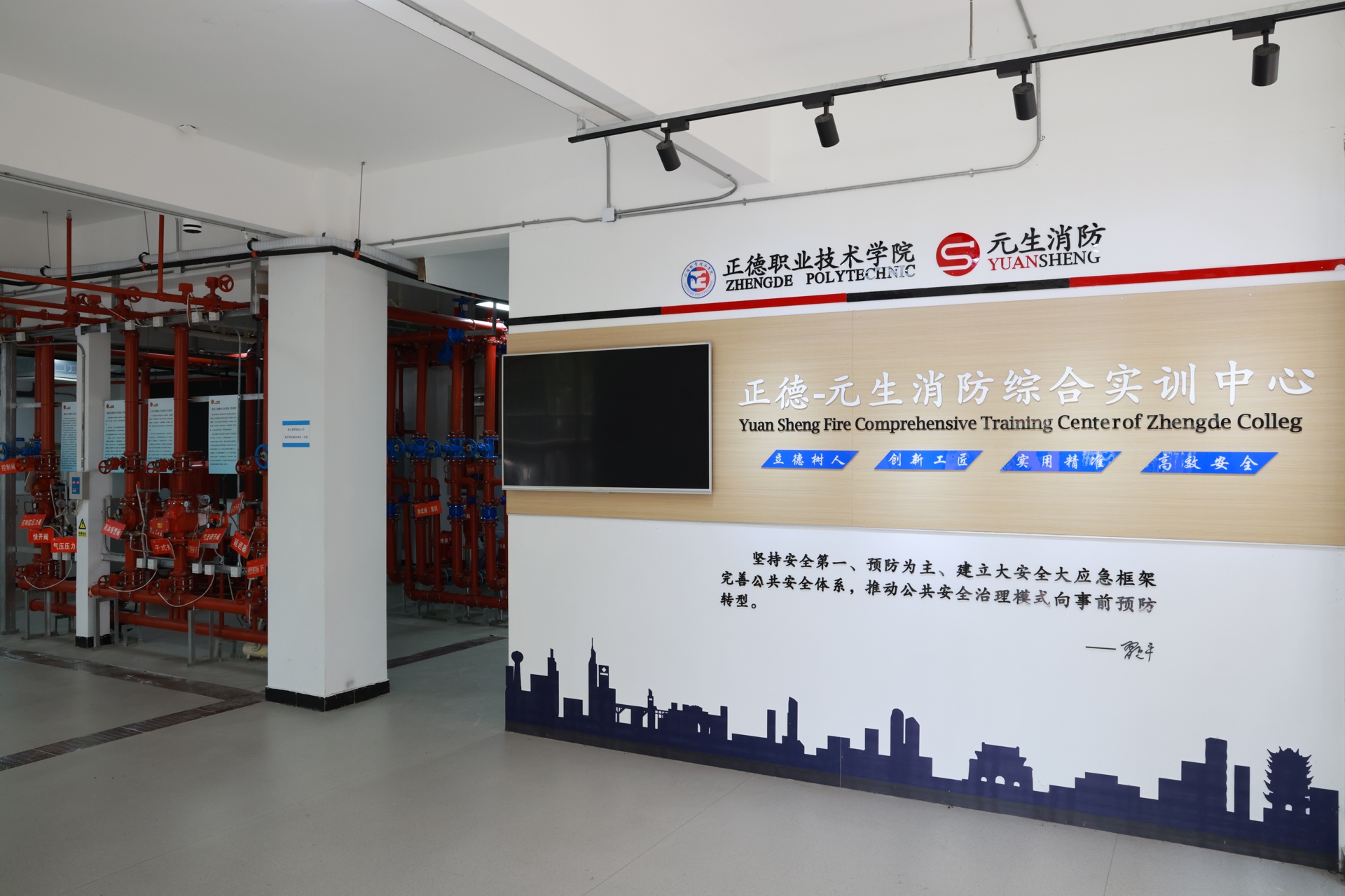 “正德—元生”消防综合实训中心占地面积约400平方米,集理论教学、实践实训、培训演练、示范展示于一体,配备100余套消防设施设备,包括消防电系统、消防水系统、消防风系统等,这些设备严格依照国家消防专业实操考核标准配置。其中,理论教学区配备了先进的多媒体设备,专业教师在这里为学生讲解关于消防工程制图、建筑防火设计、消防法规与管理等专业知识,打牢消防人才培养根基。