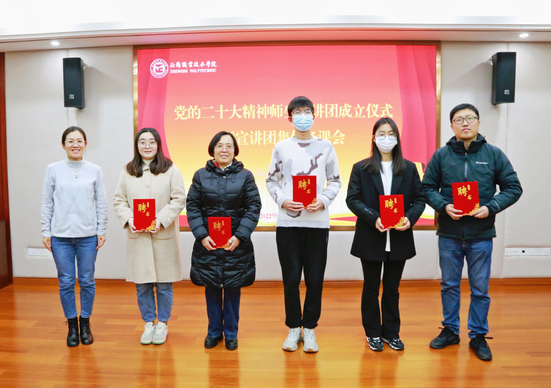 任慈为学生工作部部长祝佳俊、思政名师工作室首席教授苗秀娟、辅导员陈瑶、学生王骁、魏宇等师生宣讲团成员代表颁发聘书。