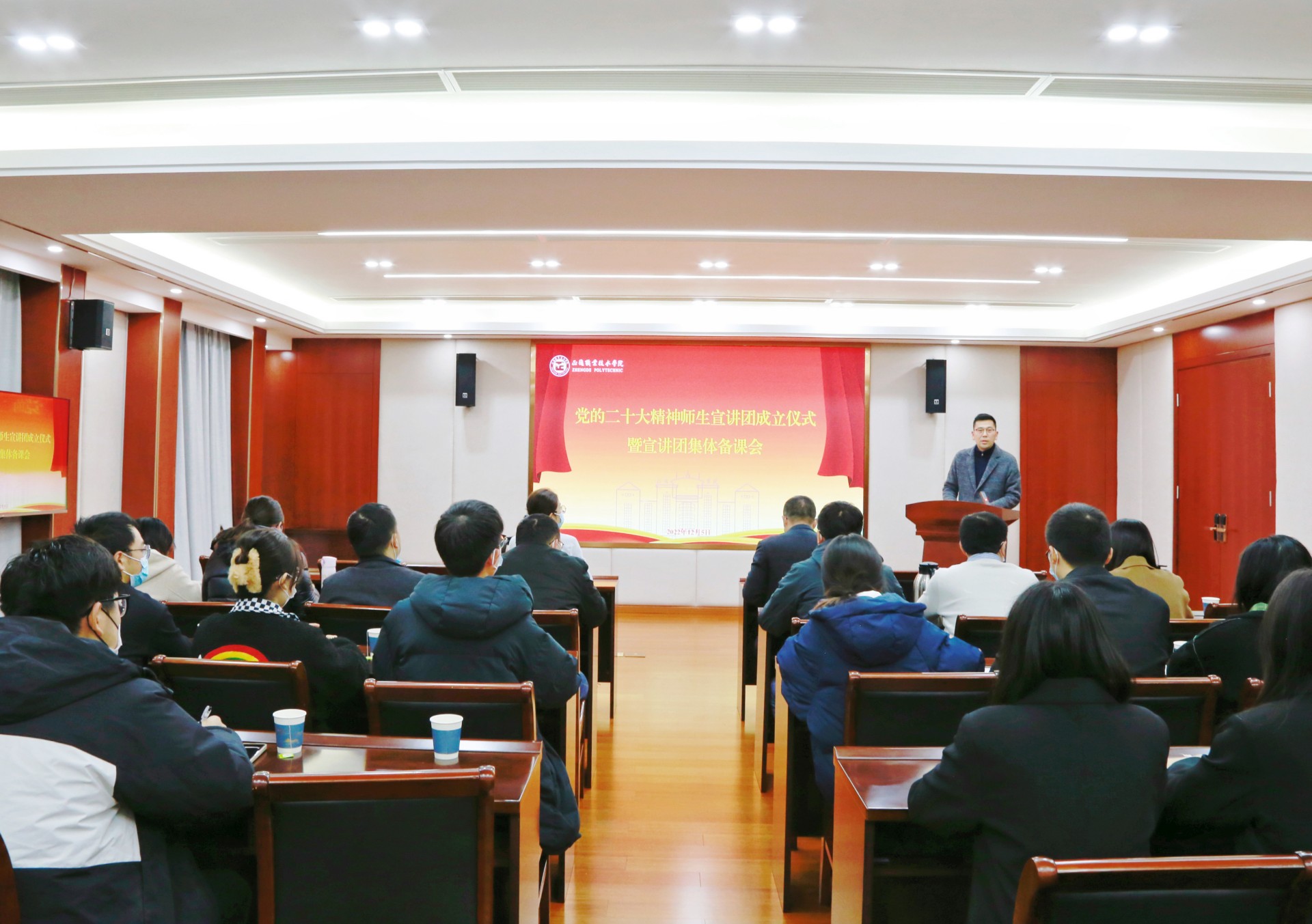 12月5日下午,户外露出 在教学楼5201会议室举行学习宣传党的二十大精神师生宣讲团成立仪式暨宣讲团集体备课会。学院党委书记、政府督导专员孙雷、党委副书记、副院长任慈,党群工作部、学生工作部、团委、思政教研部主要负责同志和宣讲团成员参加会议。会议由党群工作部部长祖国主持。