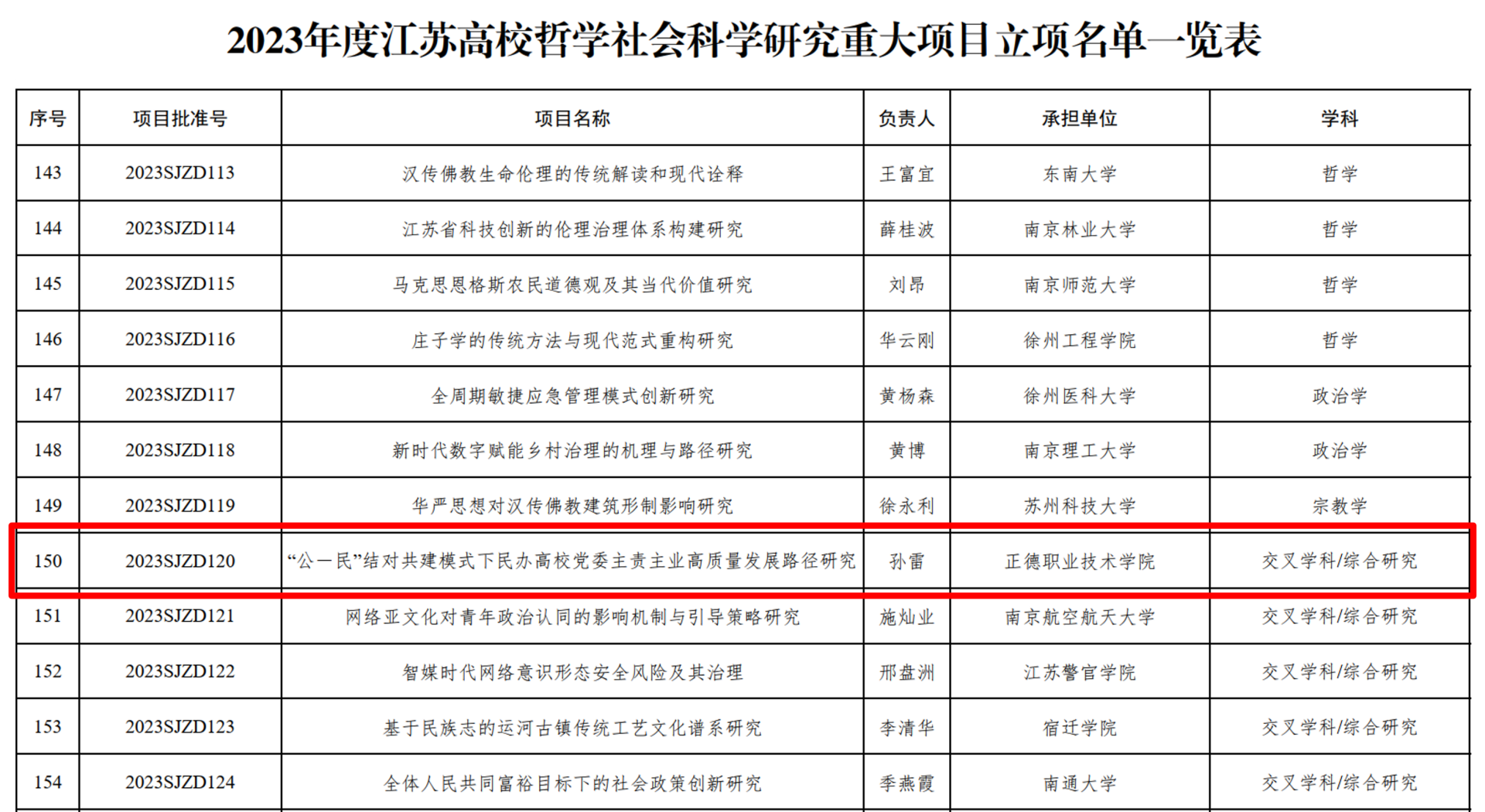 江苏高校哲学社会科学研究重大项目是由江苏省教育厅组织评审、省哲学社科界规格较高的重要科研项目。2023年度共批准设立179项,其中14所职业院校(本专科)获立16项, 户外露出 占据民办高职唯一一席。此次获得重大项目立项,实现了 户外露出 在省高校哲社研究项目领域重大项目的零突破,也是 户外露出 党建领域第一次获批省级科研项目立项,是学校“十四五”期间科研工作的新突破。