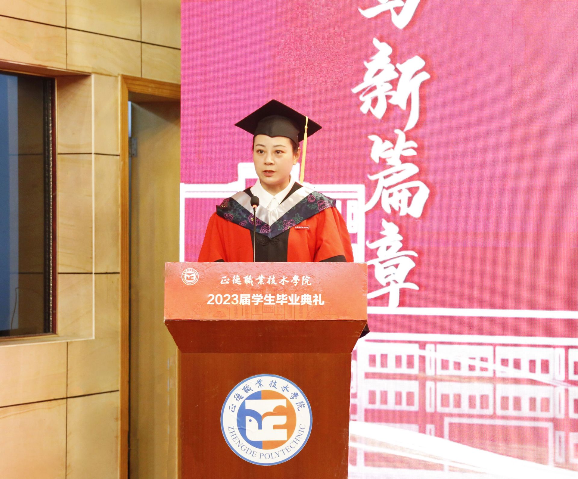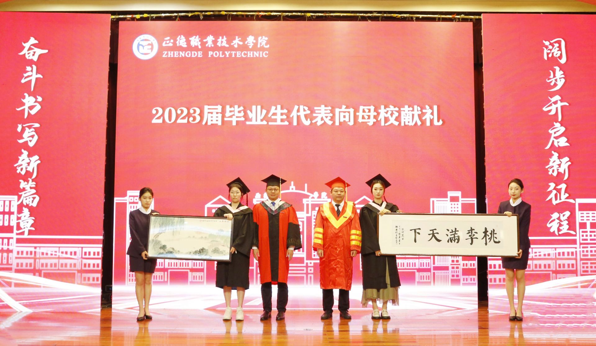 艺术设计与建筑工程系刘露和基础教育系裘壁嘉两位毕业生代表分别向母校赠送《正德厚生》《桃李满天下》两幅书画作品。风雨二十四载,愿2023届全体毕业生们继续秉持正德厚生的校训,不念过往,不负当下,不畏将来,继续书写更加灿烂辉煌的正德故事。