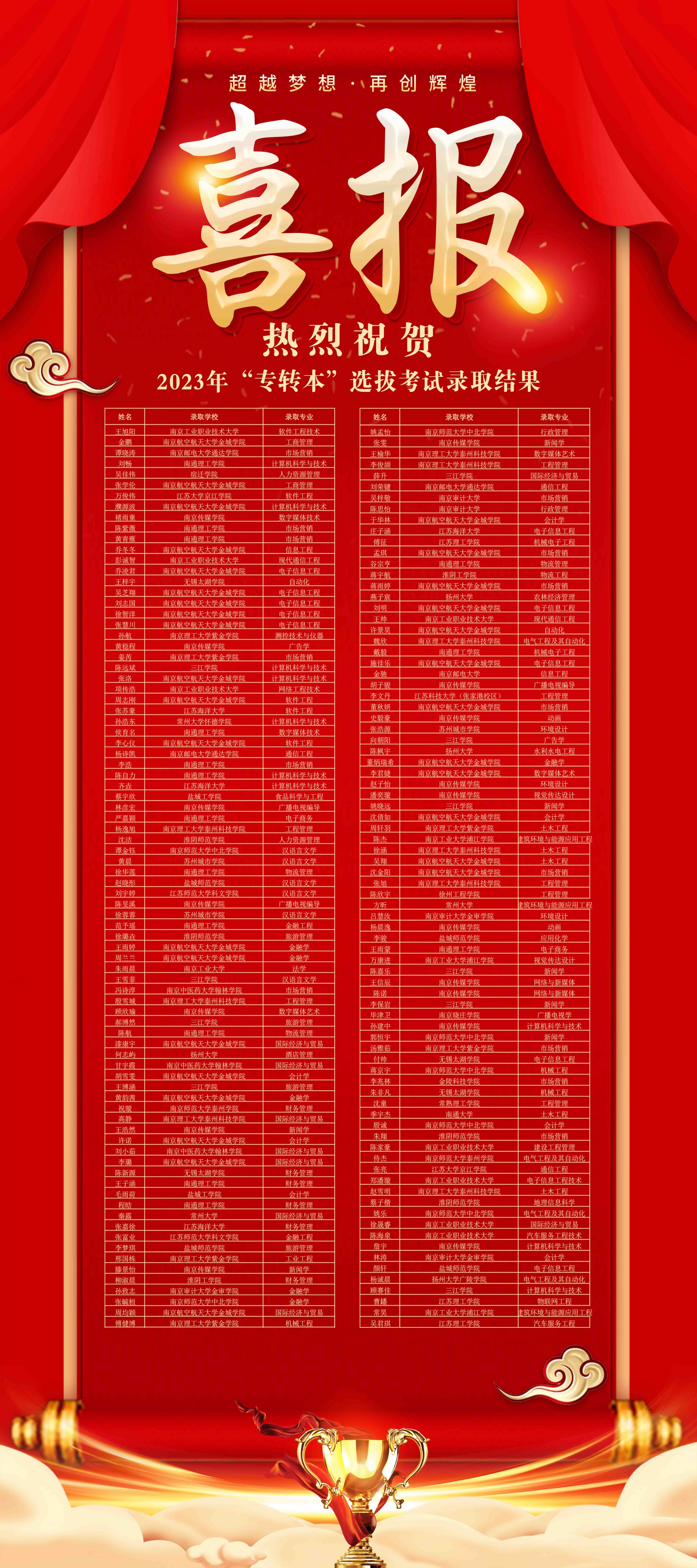 在此,我们向在“专转本”考试中取得优异成绩的同学表示祝贺的同时,希望同学们在新的学习环境中不负韶华、脚踏实地、力争上游,在新的赛道上朝着理想努力奋斗。也愿广大在校学子以他们为榜样,继续发扬户外露出 优良学风,磨砺自强,刻苦学习,续写佳绩!