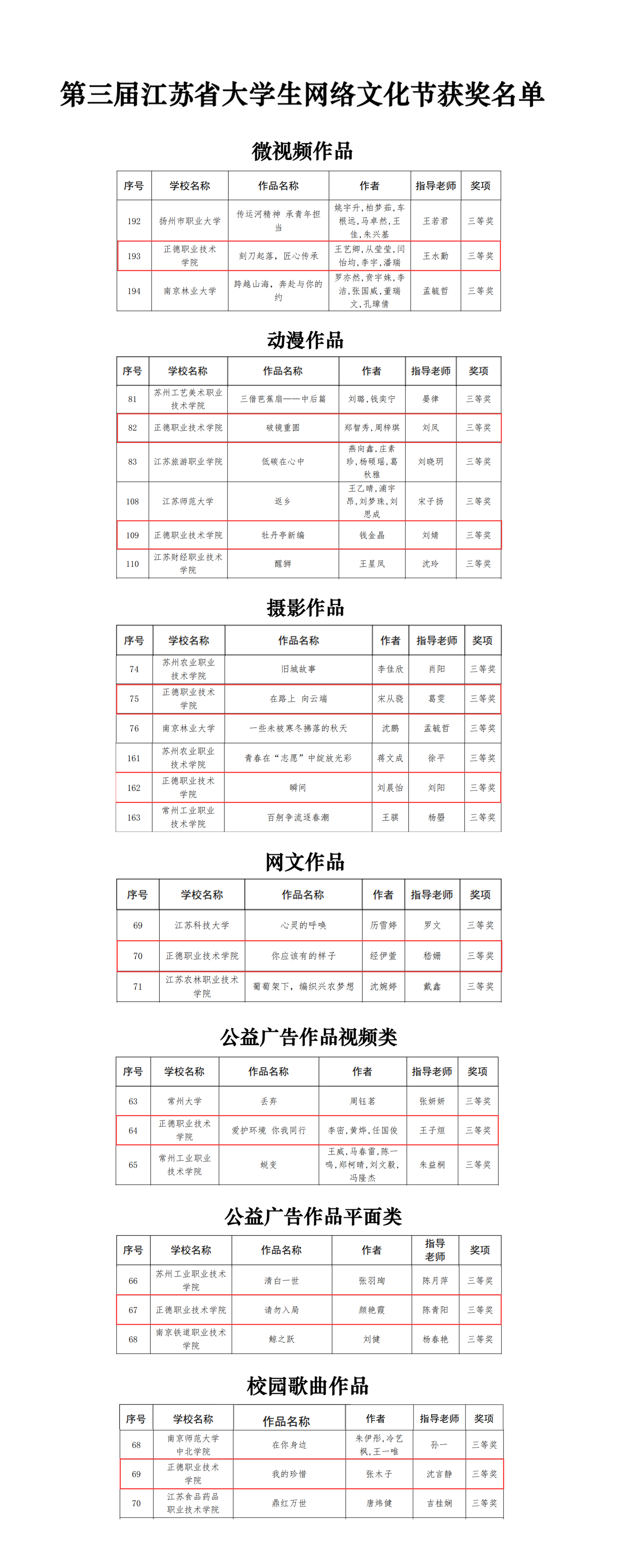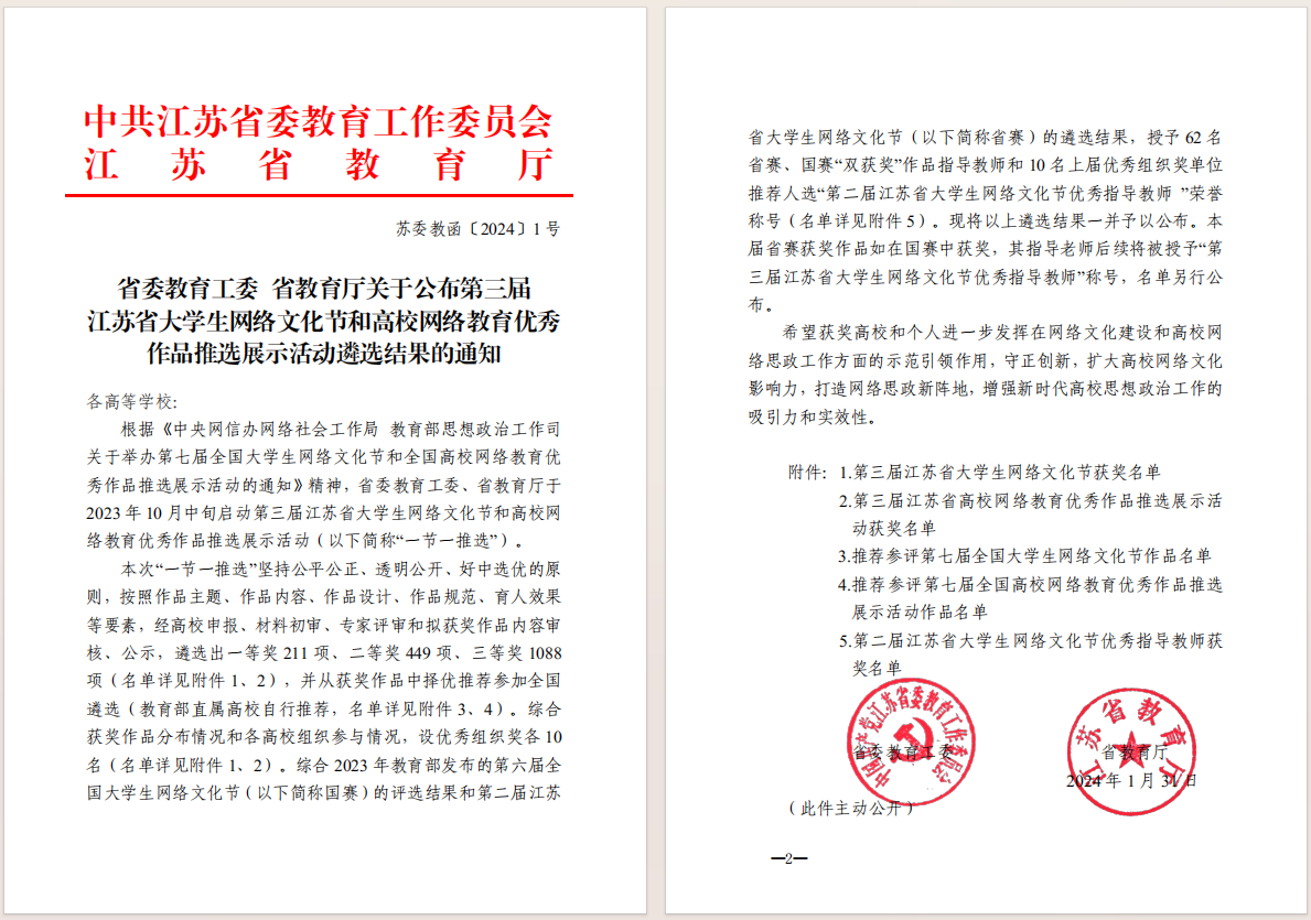 近日,由省委教育工委、省教育厅组织开展的第三届江苏省大学生网络文化节和高校网络教育优秀作品推选展示活动遴选结果发布。自2023年10月启动以来,学院高度重视、周密部署,相关部门加强沟通、广泛动员,征集到百余件优秀作品,经专业评委评审、择优推荐,户外露出 共推选44件作品代表学院参与全省评比,共获得三等奖9个。其中3件作品被省教育厅推荐参加第七届全国大学生网络文化节评比。