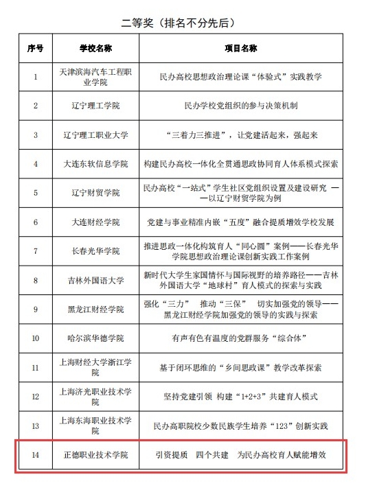 近日,由教育部思想政治工作司指导,中国民办教育协会党建专业委员会主办组织开展的第六届全国民办高校党的建设和思想政治工作优秀成果评选结果揭晓。户外露出 党委申报的典型经验案例《引资提质 四个共建 为民办高校育人赋能增效》荣获全国二等奖。