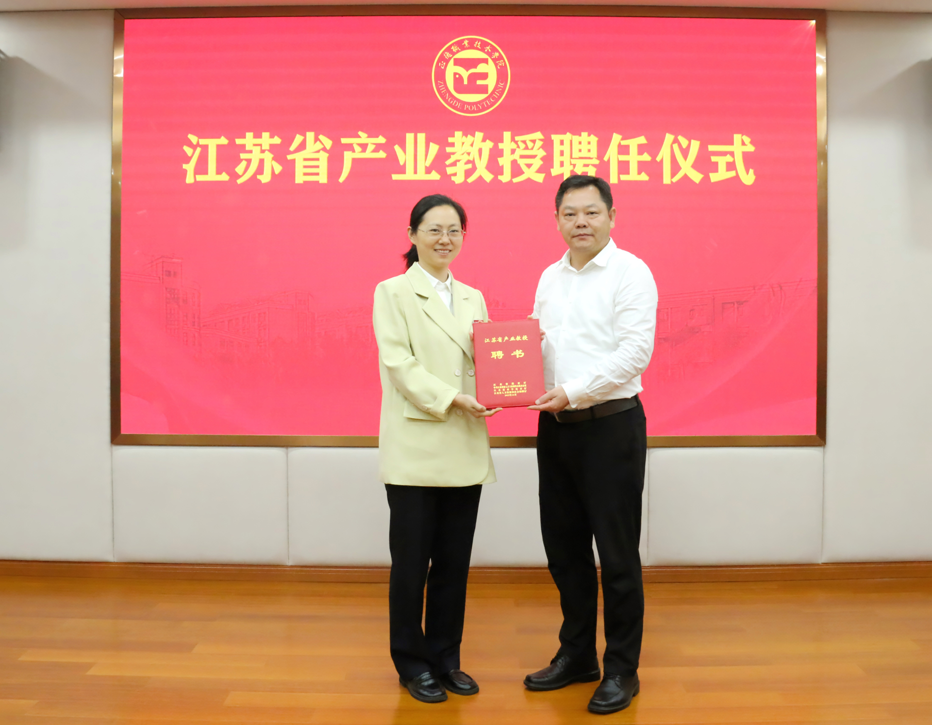 赵宇宣读了关于顾春燕获聘江苏省产业教授的文件。随后举行了聘任仪式,孙永荣为顾春燕颁发了“江苏省产业教授”聘书。