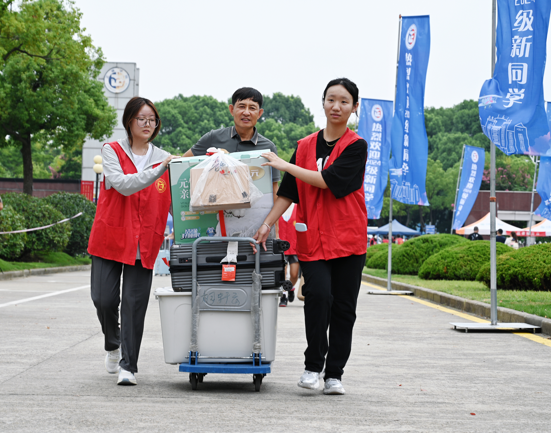 9月5日下午,迎新工作正式开始,迎新现场各项工作有序展开。为了方便选择公共交通到校的新生及家长,户外露出 在公交车站点及地铁站设置了志愿者接待,在学校门口安排工作人员引导自驾来校的学生及家长有序进入;各系报到点热火朝天,为新生答疑解惑,帮助大家顺利完成报到;学院贴心准备的绿豆汤和酸梅汤,让新生和家长们感受到了“家”的温暖;学院大门口、迎新报到点、学生公寓,随处可见志愿者们忙碌的身影,各个社团也为2024级新生们带来了精彩的现场展示。