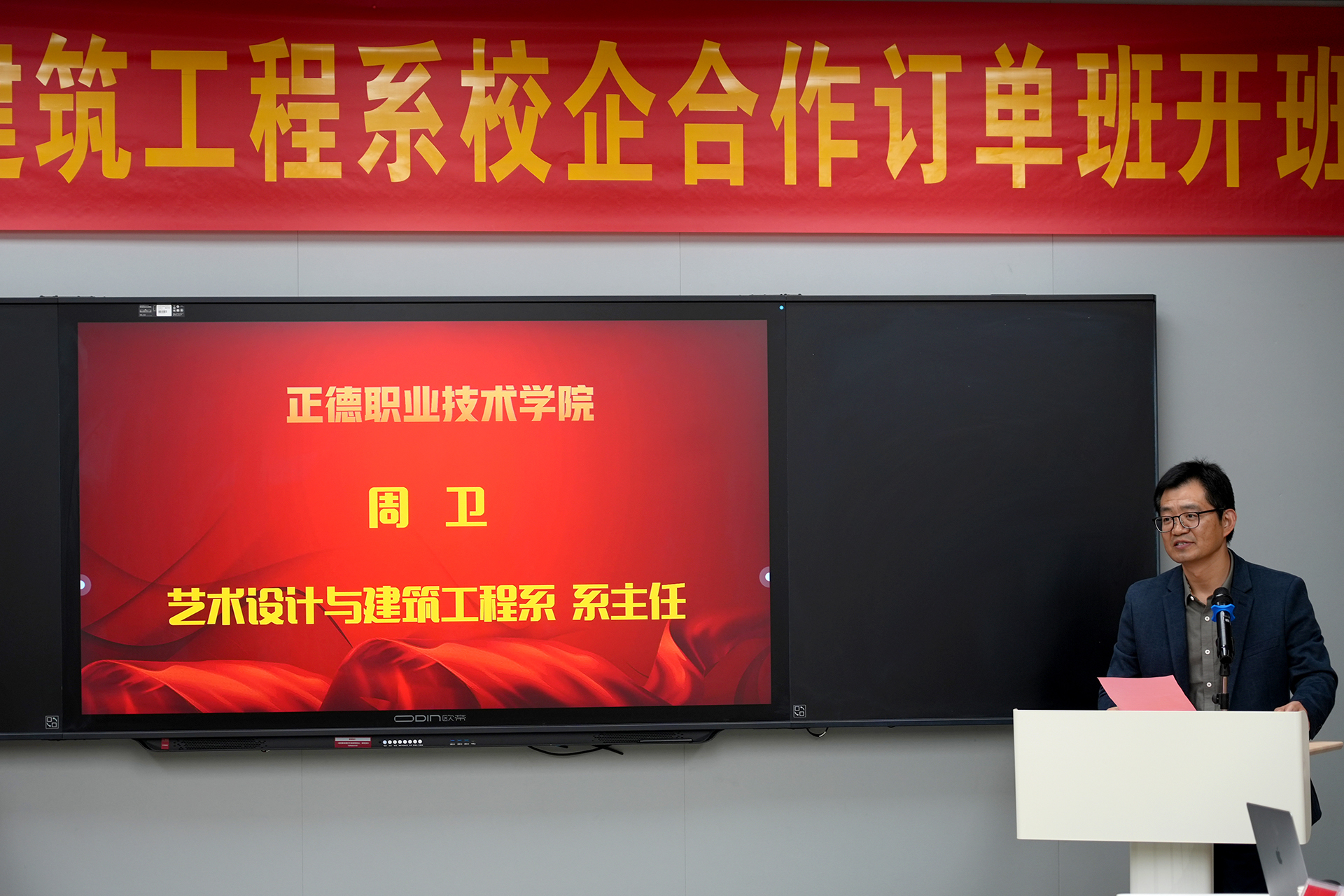 仪式开始,与会人员共同观看了两家公司的企业宣传片,深入了解了它们在装饰设计、智能科技领域的卓越成就和发展愿景。随后,艺术设计与建筑工程系主任周卫上台致辞,对两家公司长期以来对学院人才培养工作的支持和帮助表示了衷心的感谢,并期待未来双方能在更多领域展开深入合作,共同推动人才培养质量的提升。