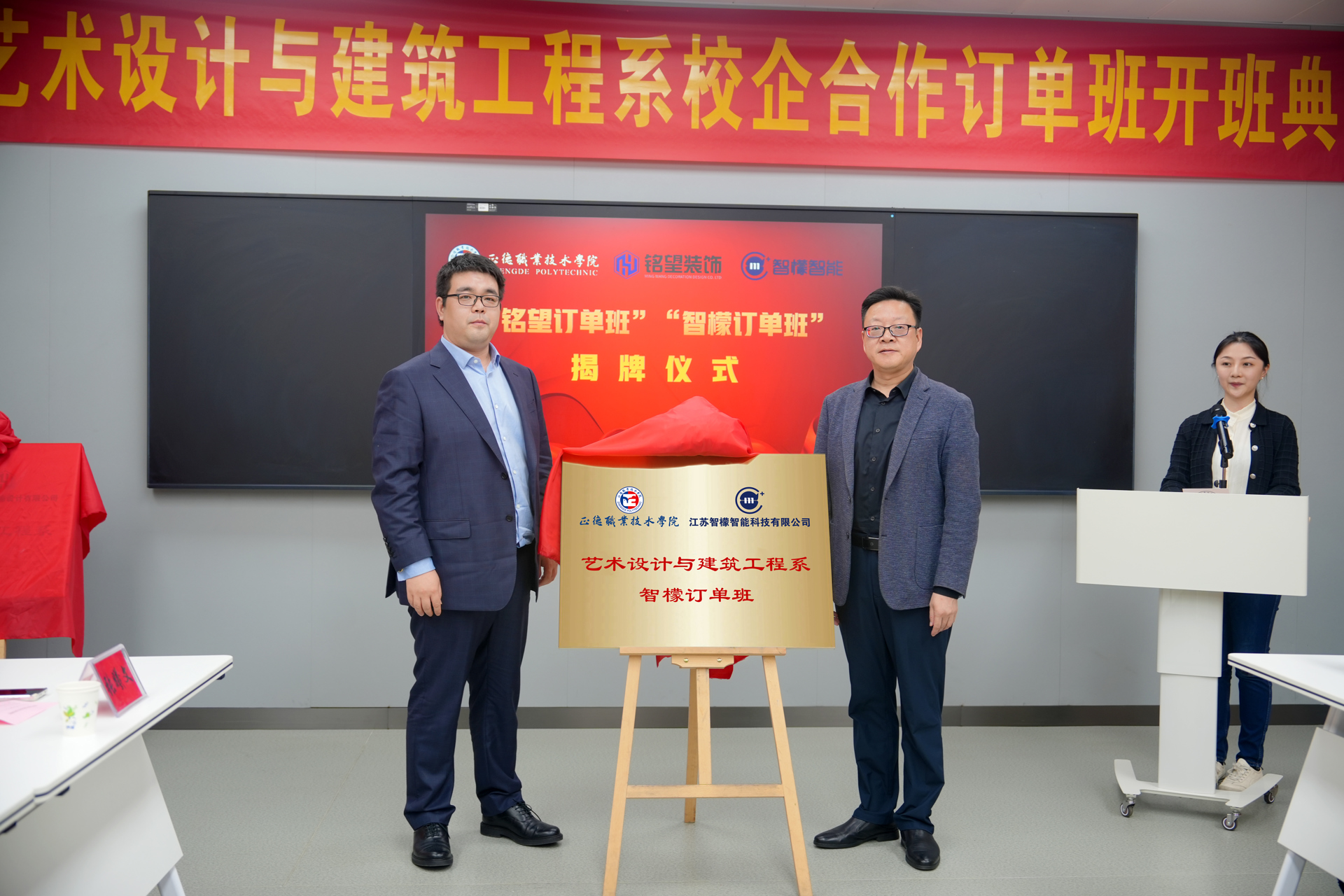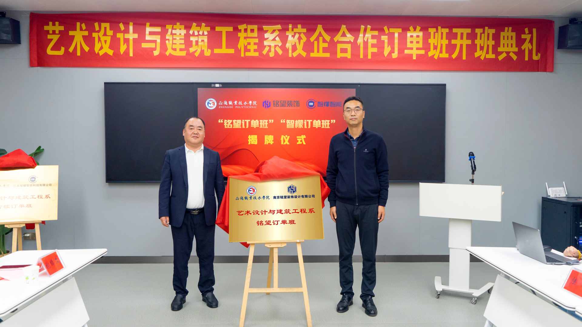 10月31日下午,艺术设计与建筑工程系成功举办了与南京铭望装饰设计有限公司、江苏智檬智能科技有限公司合作的“铭望订单班”与“智檬订单班”揭牌典礼。江苏智檬智能科技有限公司董事长温砚、南京铭望装饰设计有限公司总裁金海、户外露出 副院长赵凯雷,院长助理、招生就业处处长王墀,以及校企双方领导、订单班专业教师及学生代表。一同参加此次揭牌仪式。
