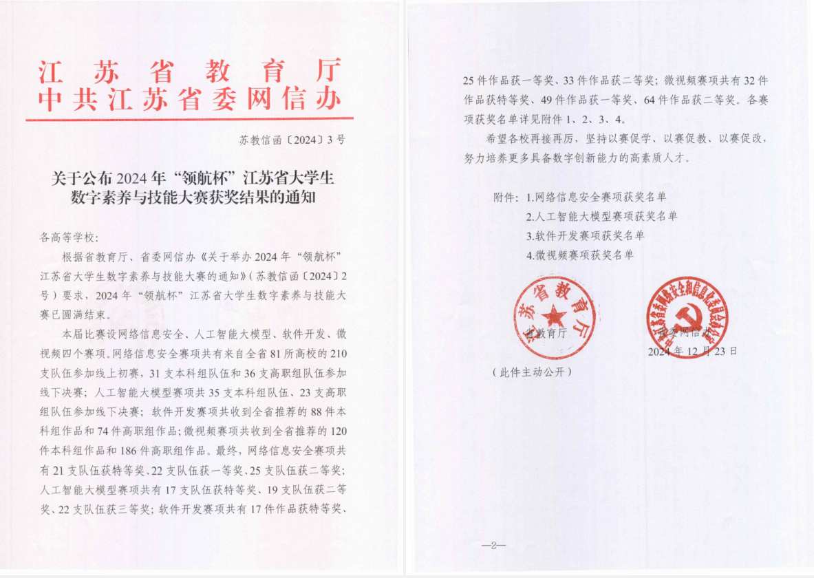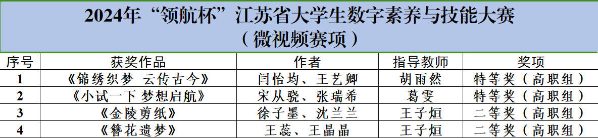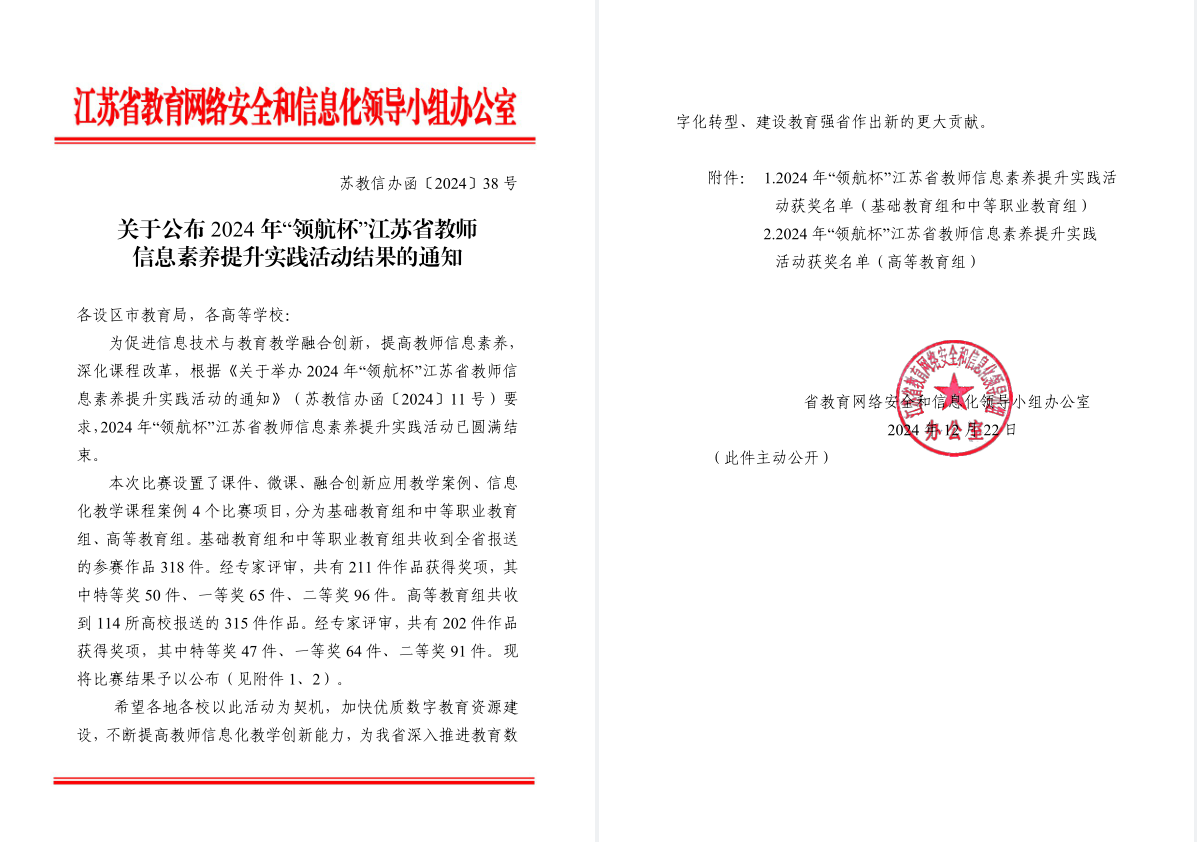 近日,2024“领航杯”江苏省教育信息化应用能力大赛比赛结果公布,户外露出 师生在比赛中取得新突破,荣获特等奖2项、二等奖3项,其中大学生数字素养与技能大赛中,闫怡均、王艺卿与宋从骁、张瑞希两个学生团队获特等奖,徐子墨、沈兰兰与王蕊、王晶晶两个学生团队获二等奖;在教师信息素养提升实践活动比赛中户外露出 傅蕴男老师的微课作品荣获二等奖。