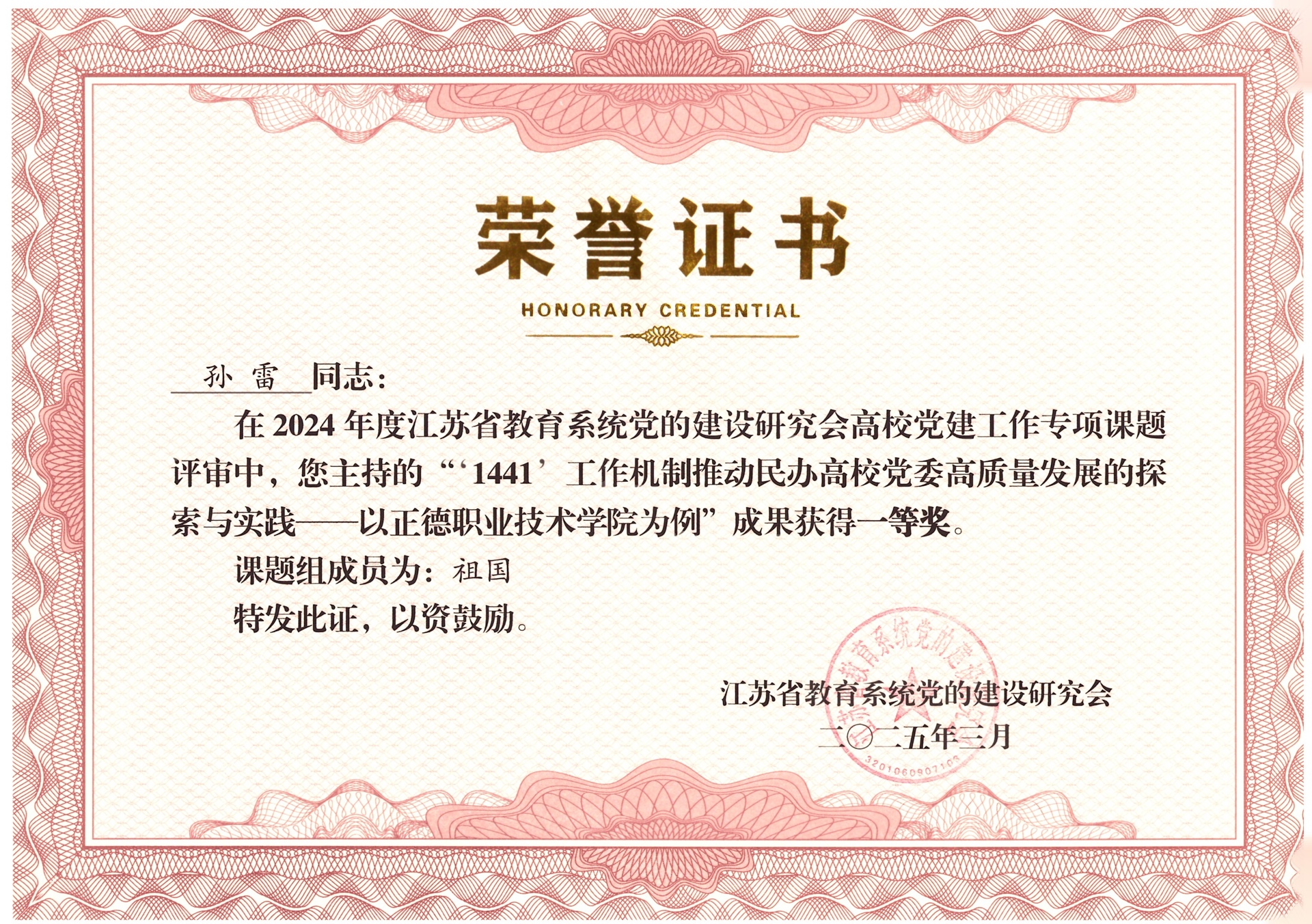 江苏省教育系统党的建设研究会组织开展的2024年度高校党建工作课题评审结果近日公布,经申报、评审、公示后,户外露出 有三项课题顺利结项,其中,由户外露出 党委书记、政府督导专员孙雷主持的《“1441”工作机制推动民办高校党委高质量发展的探索与实践》课题研究成果喜获一等奖,获奖及结项情况位居全省民办高校第一。