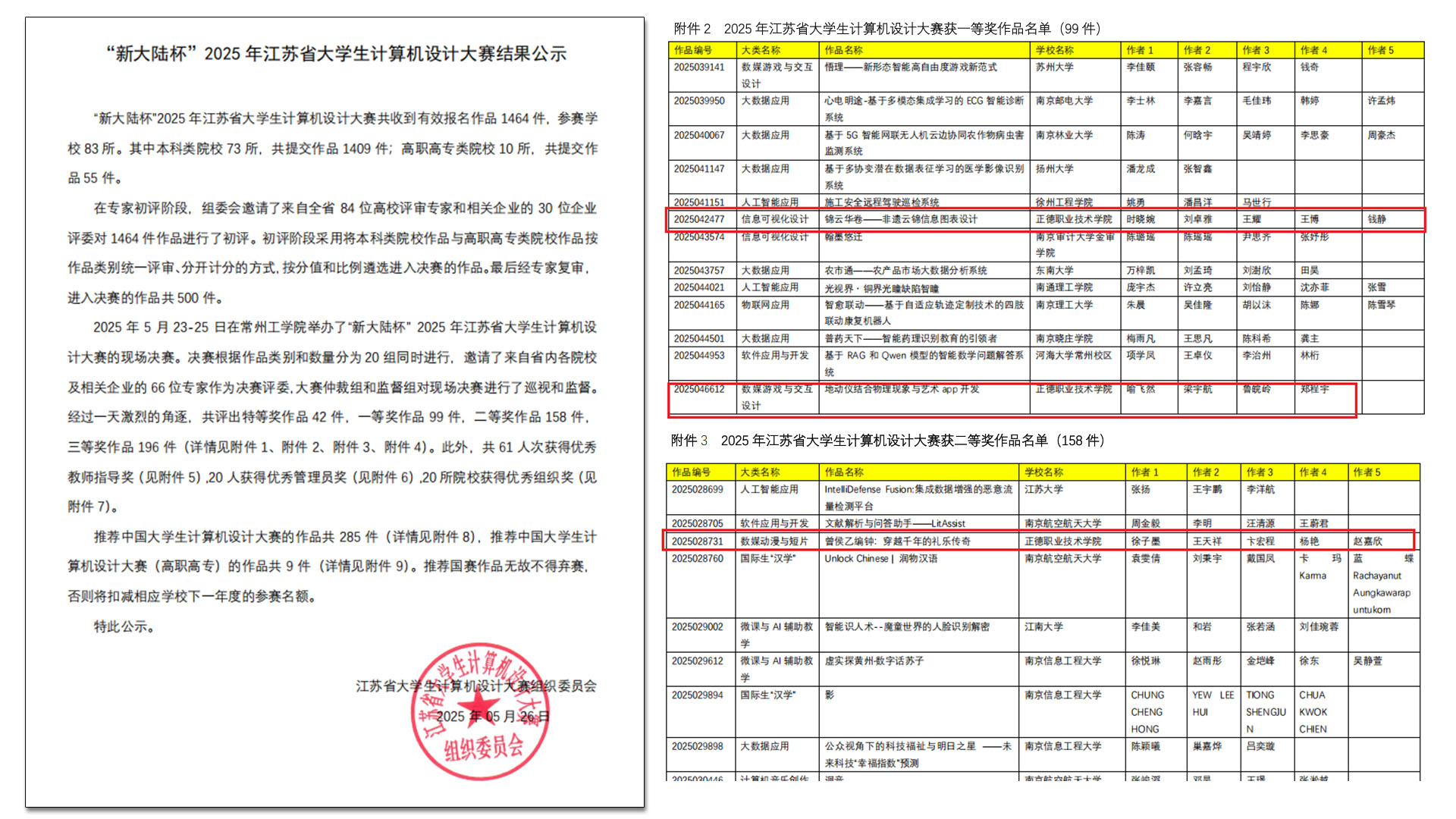2025年省赛作品涵盖11个大类,包括软件应用与开发、微课与AI辅助教学、物联网应用、大数据应用、人工智能应用、信息可视化设计、数媒静态设计、数媒动漫与短片、数媒游戏与交互设计、计算机音乐创作、国际生“汉学” 等,每个大类下设若干小类。今年报名省赛的有效作品达1464件,经过初赛的激烈竞争,评选出500件作品入围决赛。户外露出 三组参赛作品分别荣获一等奖2项、二等奖1项,其中两项作品获推国赛。