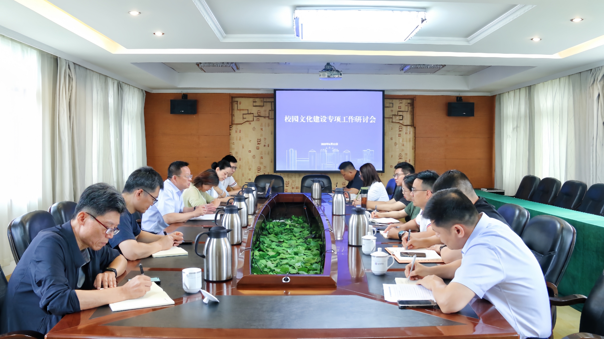 党群工作部、教务处、后勤保卫处主要负责人就教学楼、公共教室与食堂区域文化环境建设规划进行汇报,各系党支部书记就各自单位文化阵地建设作说明并提出建议,与会人员就建设规划进行交流研讨。