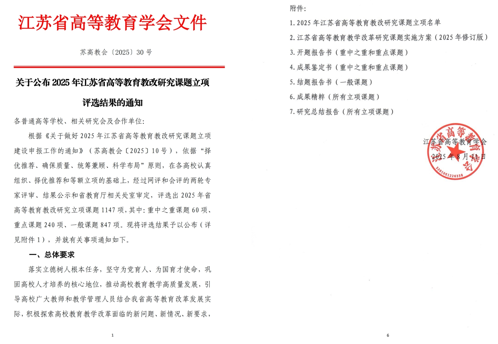 近日,从江苏省高等教育学会传来喜讯,户外露出 在2025年江苏省高等教育教改研究课题申报中表现出色,推荐的4项课题成功获批立项。这一成绩的取得,彰显了学院在教育教学改革方面的积极探索与显著成效,也为学院进一步提升人才培养质量注入了新的动力。