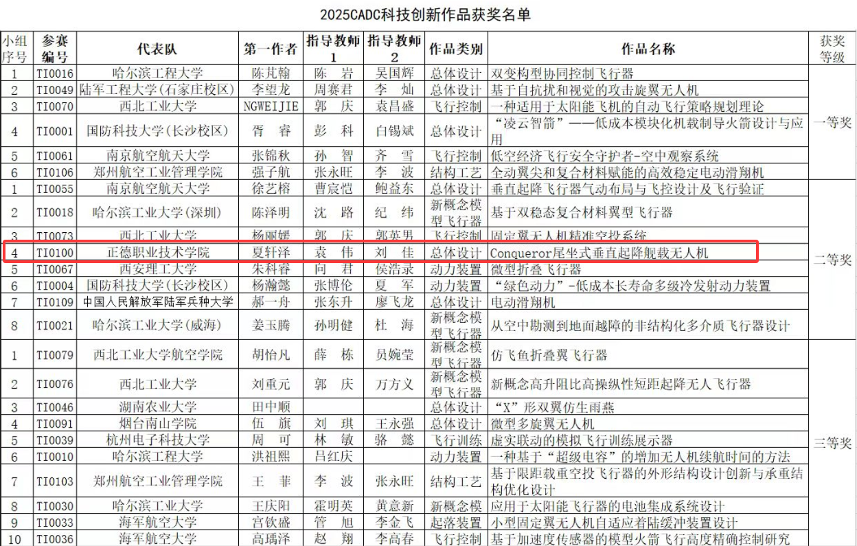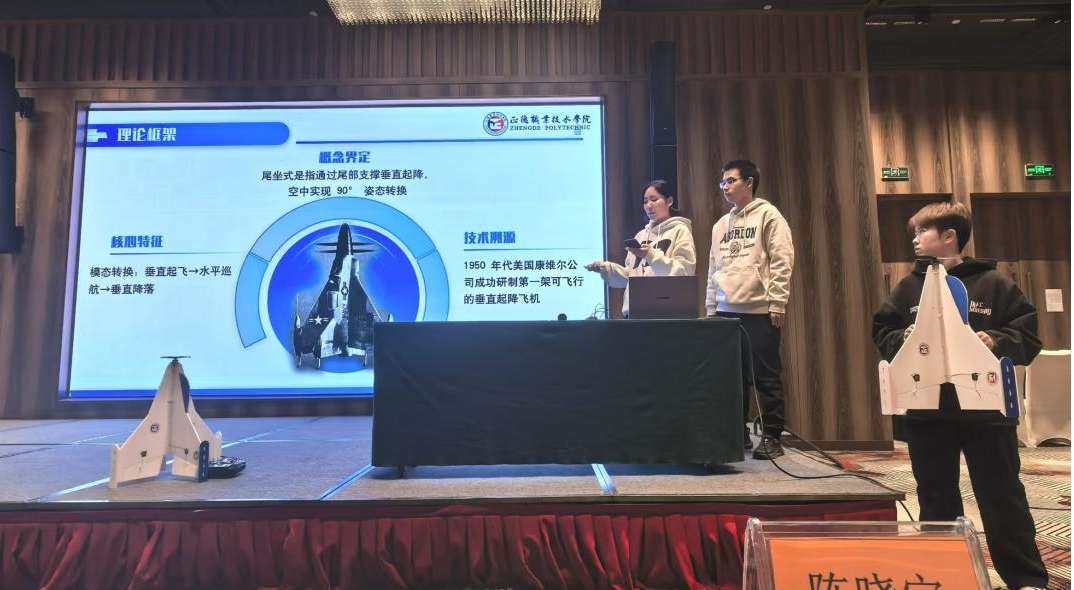 本次大赛,户外露出 航模队参加了电动滑翔机和科技创新评比两个赛项。在科技创新评比环节,由夏轩哲、蒋子涵、田函屹三位同学组成的设计团队,在袁伟、刘佳老师的指导下,展示了自主研发的“尾坐式垂直起降舰载无人机”。这一设计不仅体现了对前沿技术的理解,更展现出将理论知识转化为实践成果的能力。在答辩过程中,队员们条理清晰地阐述了创新设计理念与关键技术突破,以其扎实的专业基础和解决实际问题的能力赢得了评委的一致认可,最终荣获二等奖。