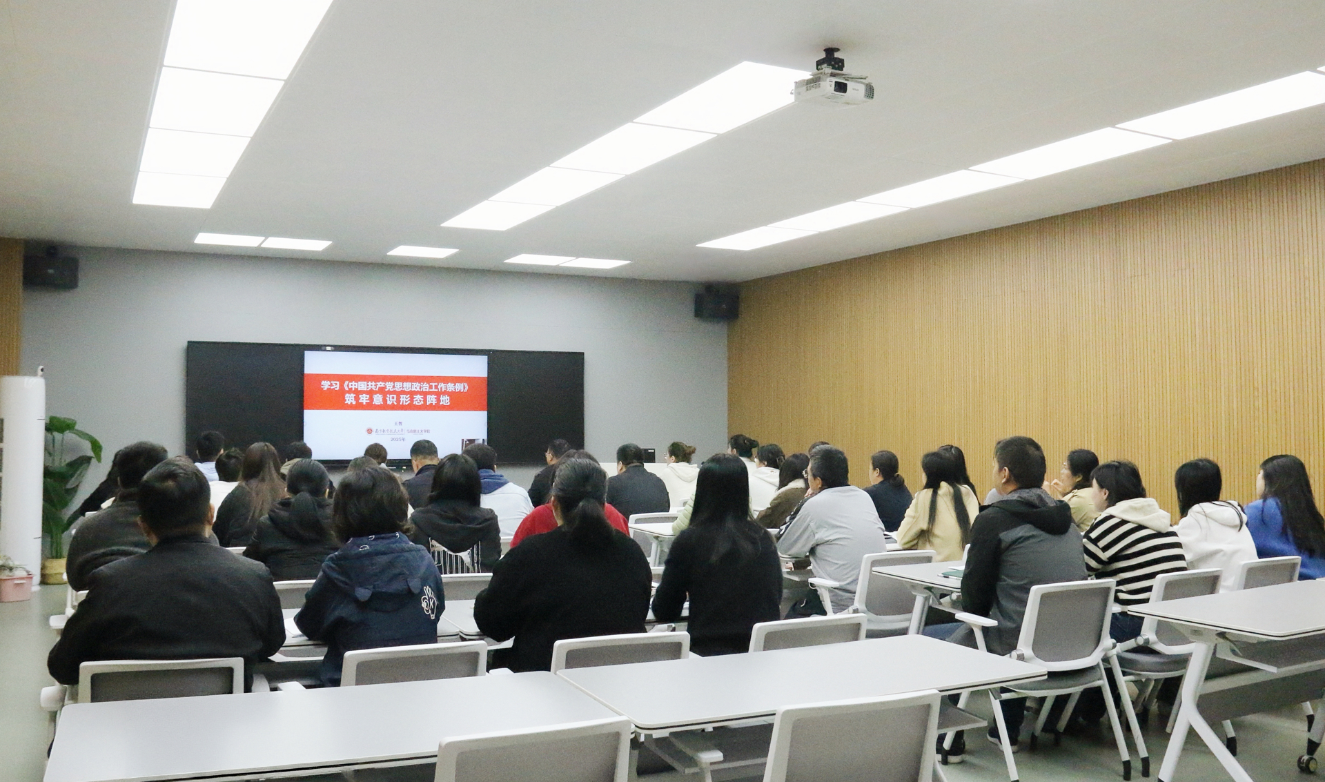 会上,学院邀请南京航空航天大学马克思主义学院院长、教授、博士生导师王智以“学习《中国共产党思想政治工作条例》,筑牢意识形态阵地”为题作辅导报告。王智紧扣《中国共产党思想政治工作条例》核心要义,从辨析意识形态领域的形势与全局性、根本性转变,深刻理解习近平文化思想的科学内涵与重大意义,贯彻落实《条例》筑牢意识形态阵地、推进文化强国建设等方面出发,深刻阐述了新时代高校做好思想政治工作及意识形态工作的重要性与紧迫性。