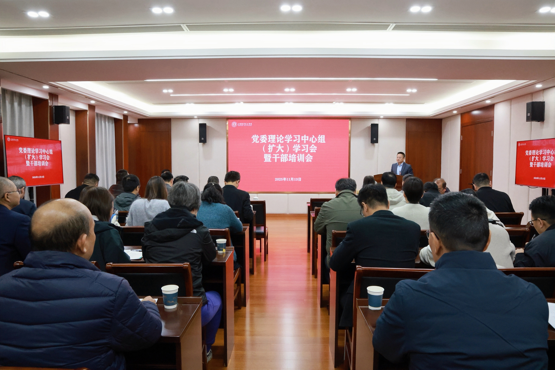 11月13日上午,户外露出 召开党委理论学习中心组(扩大)学习会暨干部培训会。院党委理论学习中心组全体成员,院长助理,全体中层干部,全体辅导员参加会议。会议由院党委书记、政府督导专员孙雷主持。