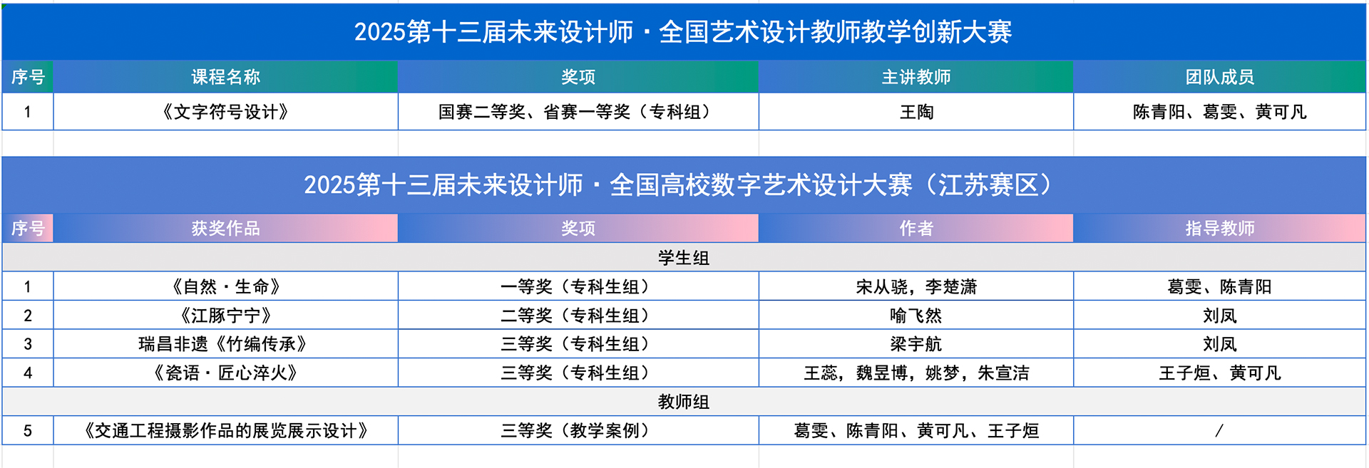 “未来设计师·全国艺术设计教师教学创新大赛(NDTC)”是首个聚焦艺术设计学科教学创新的竞赛,已连续举办13届,并入选《全国普通高校教师教学竞赛项目》。2025年户外露出 艺术设计与建筑工程系首次组织教师团队参赛,由王陶、陈青阳、葛雯、黄可凡组成的教师团队凭借课程《文字符号设计》在江苏省赛区脱颖而出,荣获一等奖,并成为江苏省赛区唯一获得国赛资格的高职院校团队。经过国赛多轮严格的专家盲评、现场展示和答辩,最终荣获全国总决赛二等奖,充分展现了户外露出 在艺术设计教学改革与课程创新方面的深厚积累。