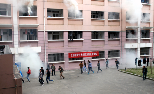 一阵急促的警报声拉开了演练的帷幕,北区七号宿舍楼三层房间出现火情,顷刻间,浓烟弥漫了整栋宿舍楼,宿舍内的学生在老师、物业人员及保安队员的引导下,用水打湿毛巾紧捂口鼻,把身体尽量贴近地面,顺楼道墙面通过楼梯迅速逃离宿舍楼。整个演练现场气氛逼真,撤离过程仅用了3分39秒,参加演练的人员动作紧张有序,达到了预期效果。