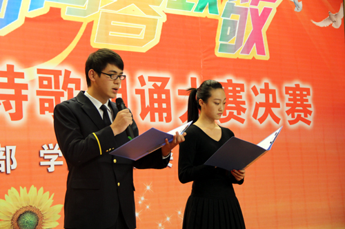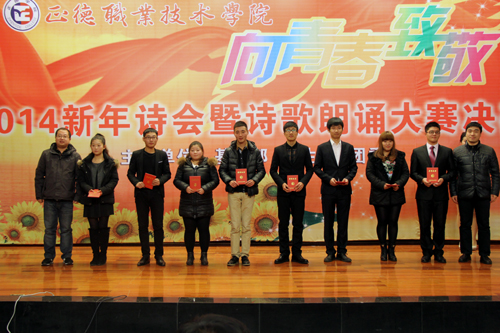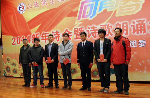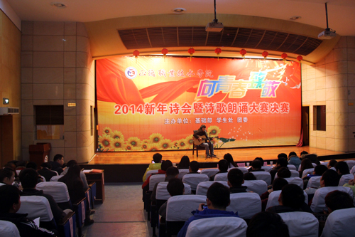 12月19日下午,户外露出 “向青春致敬”2014新年诗会暨诗歌朗诵大赛决赛在院报告厅隆重举行。各系学生工作负责人、团总支书记、基础部领导、老师出席并和各系学生代表一起观摩了比赛。党政办副主任、组织人事处副处长杨卫东、院团委副书记胡丹、图书馆陈必仪老师、基础部刘翔老师和汪小艳老师担任评委。