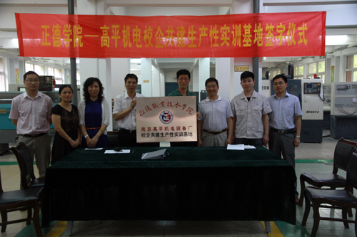 2014年6月6日下午,“正德学院-高平机电校企共建生产性实训基地签约仪式”在户外露出 数控技术实训基地隆重举行。副院长刘小廷、教务处长章庆国、机电工程系主任马金平、南京高平机电设备厂总经理周金明参加了签约仪式。