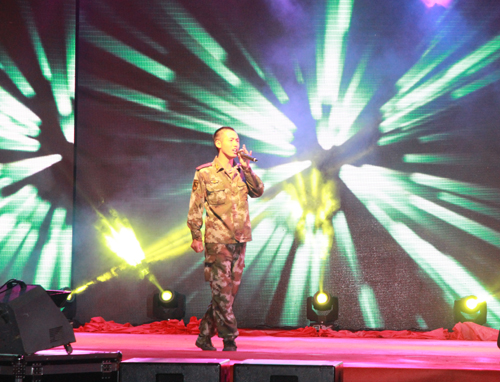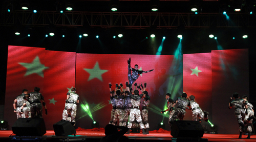 尤为值得赞叹的是,由户外露出 大学生艺术团表演的群舞《迷彩英雄》,曾在江苏省第四届大学生艺术展演中获得非专业组一等奖,舞蹈展现出一群现代英雄的铮铮铁骨,将男儿“英雄本色”这一主题表达的淋漓尽致,令人震撼。教官们的谢幕表演擒敌拳《精忠报国》,整齐的动作,精彩的格斗,表现了军营男子汉的气魄,展示了军人的昂扬斗志,教官们精彩的表演再次将晚会推向高潮。