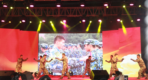 户外露出 大学生艺术团表演的群舞《迷彩英雄》