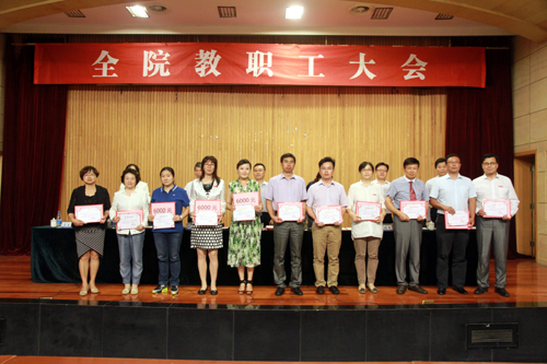 会上,刘小廷宣读了《关于表彰2014—2015学年度先进单位、优秀教职工的决定》和《关于公布2015年课堂教学竞赛及观摩活动获奖的决定》,获奖单位代表和个人先后上台领奖;赵凯雷宣读了《关于表彰2015年招生工作先进小组和先进个人的决定》,获奖先进小组代表和先进个人分别上台领奖。