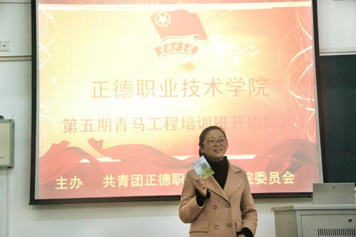 仪式上胡丹老师首先介绍了“青马工程”培训班的目的、意义,培训日程安排、培训要求及考核办法。接着结合个人经历和学员们分享了“如何成为一名合格的学生干部“,她希望学员们珍惜利用好本次培训机会,认真学习,积极实践,真正成为一名德才兼备的学生干部,发挥好自身桥梁和榜样作用。开班当天正值“一二•九”运动80周年纪念日,全体成员观看了《大抗战——“一二•九”纪录片》。
