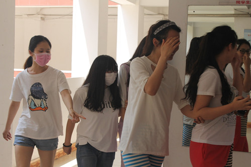 演练中学生们 紧张而有序撤离火场