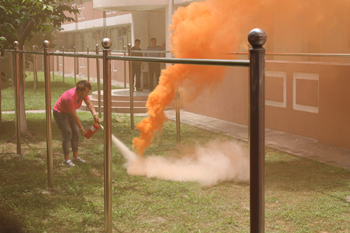 上午九时,治安保卫处对照演练方案仔细检查了演练现场,并向南区一号宿舍楼全体宿管及学生讲解、示范了各类专业消防工具的使用及火场具体逃生方法、逃生路线,参与部门负责人及各工种悉数到场、明确了各自的职责。中午十二时三十分,随着演练活动总指挥的一声令下,疏散演练正式开始。现场燃起滚滚浓烟,宿管值班员发现后立即拨打119火警电话、校园微型消防站和保卫处值班电话。宿管人员在一分钟内进行了初期火情扑救,微型消防站义务消防员在三分钟内到达现场进行了扑救,江宁区消防中队接到火情后两辆消防车在五分钟内到达学校现场开展扑救。现场工作人员在楼内有序引导学生紧急疏散、撤离到安全地点,并清点人数。校卫队维持秩序,对经过车辆和人员进行管控。至此,消防逃生演练活动取得圆满成功。