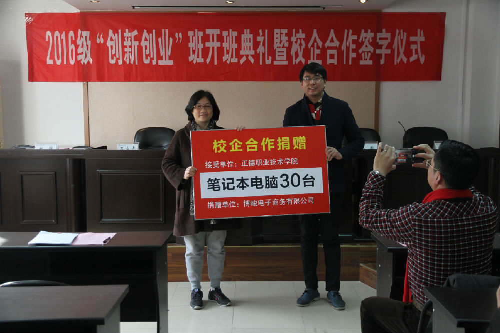 开班典礼上,刘小廷副院长与屈伯俊董事长共同签署创新创业班人才培养及基地共建协议,教务处吕立志处长与王翔经理共同为人才培养基地揭牌,蒋宁主任代表该系接受了企业的捐赠。