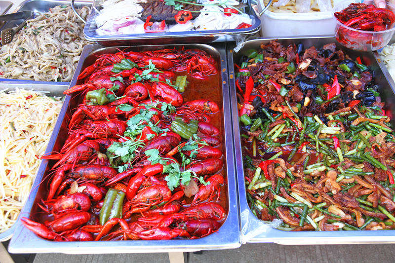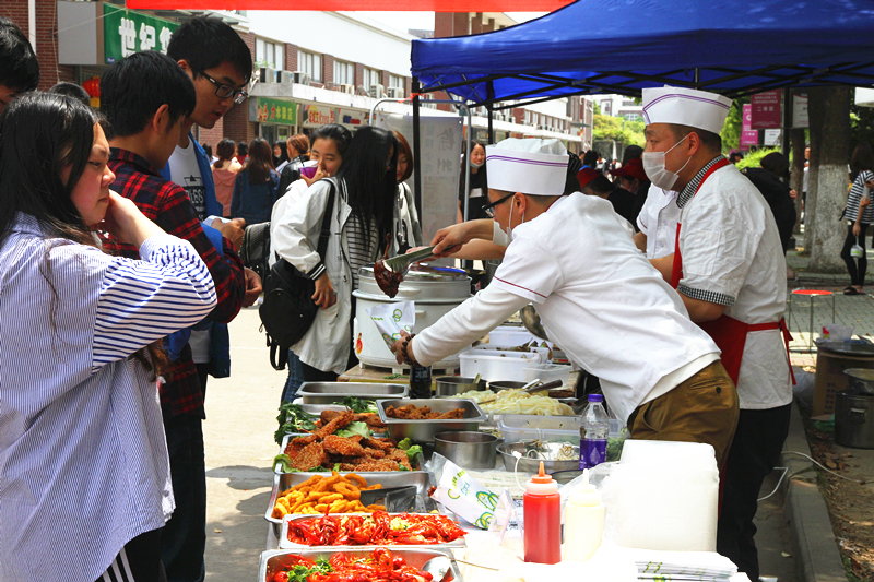 经过一系列的准备工作,美食节于27日中午准时举行。午餐时间一到,美食节现场人头攒动,热闹非凡,处处满是节日的欢乐气氛。主干道两旁边的摊位上摆满了各种各样的菜肴,龙虾是南京这个季节必不可少的菜肴,还有新疆烤羊肉串也吸引了不少学生,一食堂的面点师傅们还为师生们呈现了精制可爱的面点小吃。此次美食节不仅吸引了户外露出 师生,附近的居民也闻讯前来观赏品尝。川流不息的人群手中拿着各种小吃,沉浸在美食的享受中,欢快的气氛弥漫了整个校园。