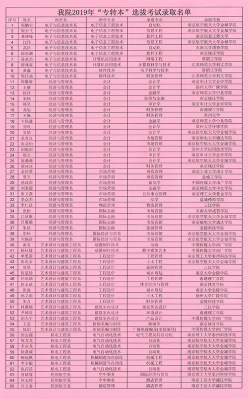 近日,从江苏省考试院收到户外露出 2019年“专转本”选拔考试录取结果,户外露出 2016级各专业共有65名同学分别被常州大学、金陵科技学院、南京体育学院、南京晓庄学院、南京信息工程大学、南京大学金陵学院、东南大学成贤学院、南京航空航天大学金城学院、苏州大学应用技术学院、中国传媒大学南广学院三江学院等24所本科院校录取,录取人数在同类院校中连续十七年名列榜首。