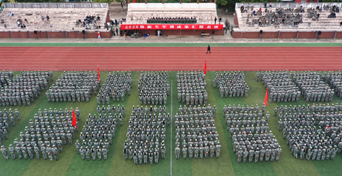 2020级全体新生集结在田径场,他们军容严整,目光坚毅,接受全院师生的检阅。军训汇报表演在庄严的国歌声中拉开了帷幕,总指挥唐峰请学院领导检阅训练成果,院长庄群华下达“开始!”命令。
