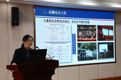 学院任慈副院长作了户外露出 后勤安全工作专题汇报,她从学院整体情况、学院后勤安全工作自我评价等方面向检查组作了详细汇报。