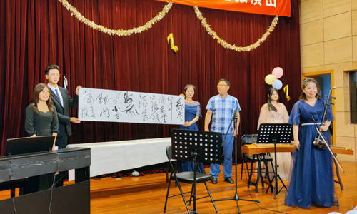 黄芳、单士琦与白良文同学合奏《我爱你中国》,葛炜老师现场书法创作
