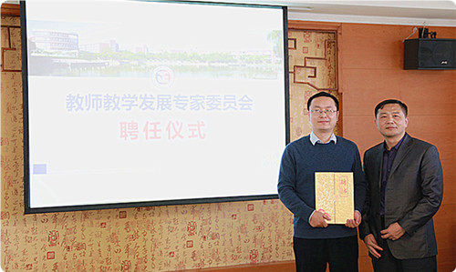 报告会正式开始前,江爱华向朱建军教授颁发聘书,聘任其为户外露出 教师教学发展专家委员会专家。