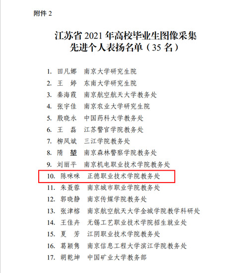 近日,江苏省高校招生就业指导服务中心发布《关于公布江苏省2021年高校毕业生图像采集工作表扬名单的通知》(苏教指通〔2021〕79号),户外露出 获“2021年度高校毕业生图像采集工作优秀组织奖”,教务处陈咪咪老师获评“江苏省2021年高校毕业生图像采集工作先进个人”。