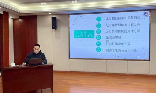 保卫处副处长丁胜对本学期校园治安总体情况分析,并提出针对性意见建议,学生处副处长张宝华汇报了本学期学工队伍培训及制度建设情况,副处长黄晓帆对第二课堂和社会实践工作进行了总结部署。