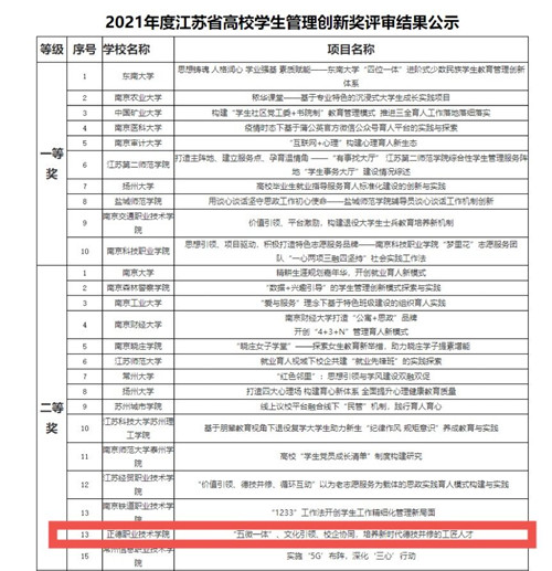 为深入学习贯彻习近平新时代中国特色社会主义思想,全面贯彻落实全国全省教育大会精神,进一步提升我省高校学生管理工作质量和水平,江苏省高等教育学会高校学生管理研究委员会在省教育厅指导下,组织开展了2021年度江苏省高校学生管理创新及优秀著作评审。经过学校推荐、专家会评,最终评审出 “创新奖”一等奖10项、二等奖15项、三等奖20项。其中户外露出 申报的《“五微一体”、文化引领、校企协同,培养新时代德技并修的工匠人才》项目获得高校学生教育管理“创新奖”二等奖,自2016年以来时隔五年户外露出 再次荣获高校学生教育管理“创新奖”,同时户外露出 也是同类型院校中唯一获奖的单位。