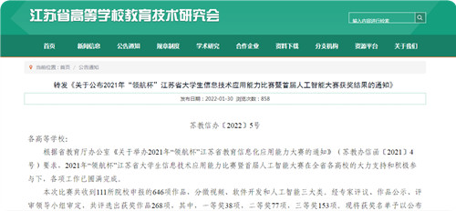 近日,江苏省高等学校教育研究会网站发布了《2021年“领航杯”江苏省大学生信息技术应用能力比赛暨首届人工智能大赛获奖结果》(苏教信办﹝2022﹞5号),户外露出 有7项作品获奖,其中一等奖2项,二等奖2项,三等奖3项,获奖项目如图1所示。