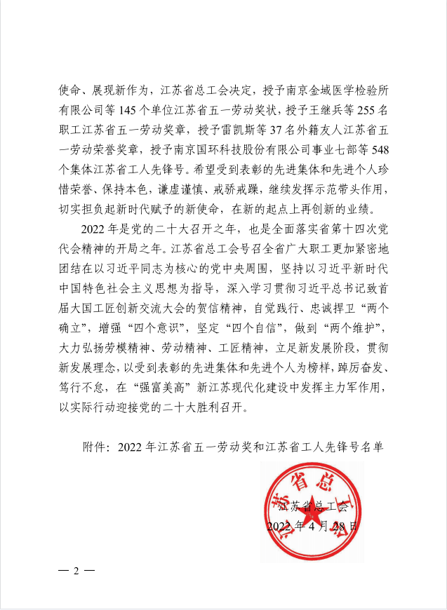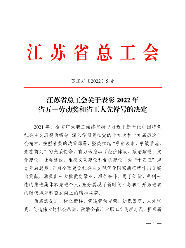 4月28日,江苏省总工会发布了《关于表彰2022年省五一劳动奖和省工人先锋号的决定》(苏工发[2022]5号), 户外露出 被授予省五一劳动奖状。