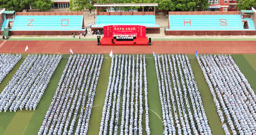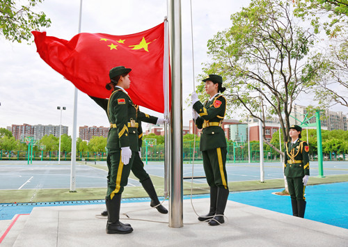 英姿飒爽的国旗护卫队护送五星红旗入场。在雄壮的国歌声中,国旗迎着阳光冉冉升起,开学典礼正式拉开序幕。