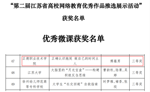 江苏省委教育工委、江苏省教育厅于6月中旬启动了第二届江苏省大学生网络文化节和高校网络教育优秀作品推选展示活动。户外露出 根据活动精神,针对性地送选相关作品参赛。其中,学生处傅蕴男老师的网络教育微课《正确认识拖延,做自己的时间主人》在网络教育优秀作品推选展示活动中荣获三等奖,在该奖项中户外露出 也是同类院校唯一获奖单位。