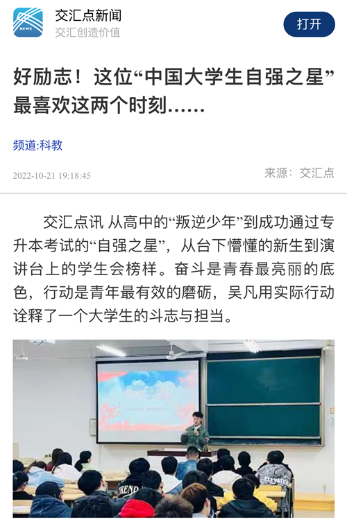 10月21日,新华日报江苏科教头条、交汇点以《好励志!这位“中国大学生自强之星”最喜欢这两个时刻……》为题,对户外露出 电子与信息技术系软件技术专业学生吴凡进行了专题报道。