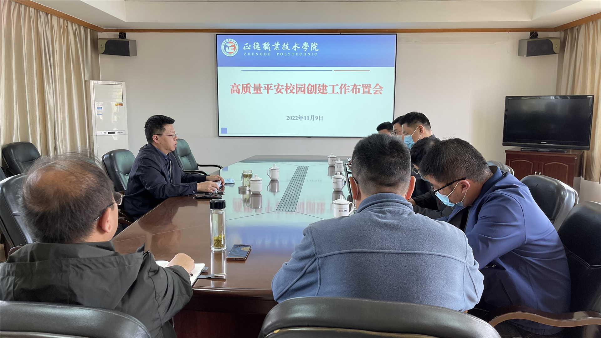 副院长高斌,院长助理、党政办主任王伟,党群工作部、教务处、后勤处及保卫处等相关单位负责人参加会议。保卫处处长包毅围绕创建申报工作要求与形式,就创建考核指标从十个方面进行了细化解读,明确相关牵头单位与支撑材料要点。相关单位负责人也就创建工作提出了相关建议。