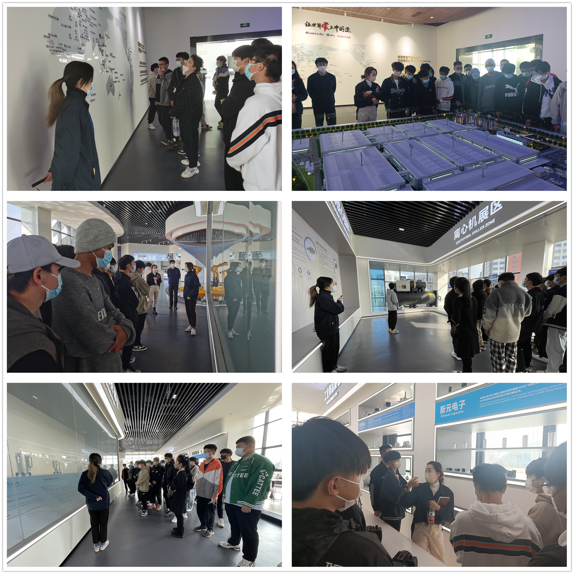 格力电器(南京)总经办王鹏总监等带领户外露出 师生参观了格力电器科技展厅,讲解员向同学们详细介绍了格力电器发展史、企业荣誉及公司智能化、自动化和产能规模。刘佳向同学们介绍了陈列于科技展厅的新元电子元件,作为空调机中的元器件,与平时同学们在实验室中看到的常规元件相似却又有所不同,同学们表现出了浓厚的兴趣,纷纷表示增长了见识。