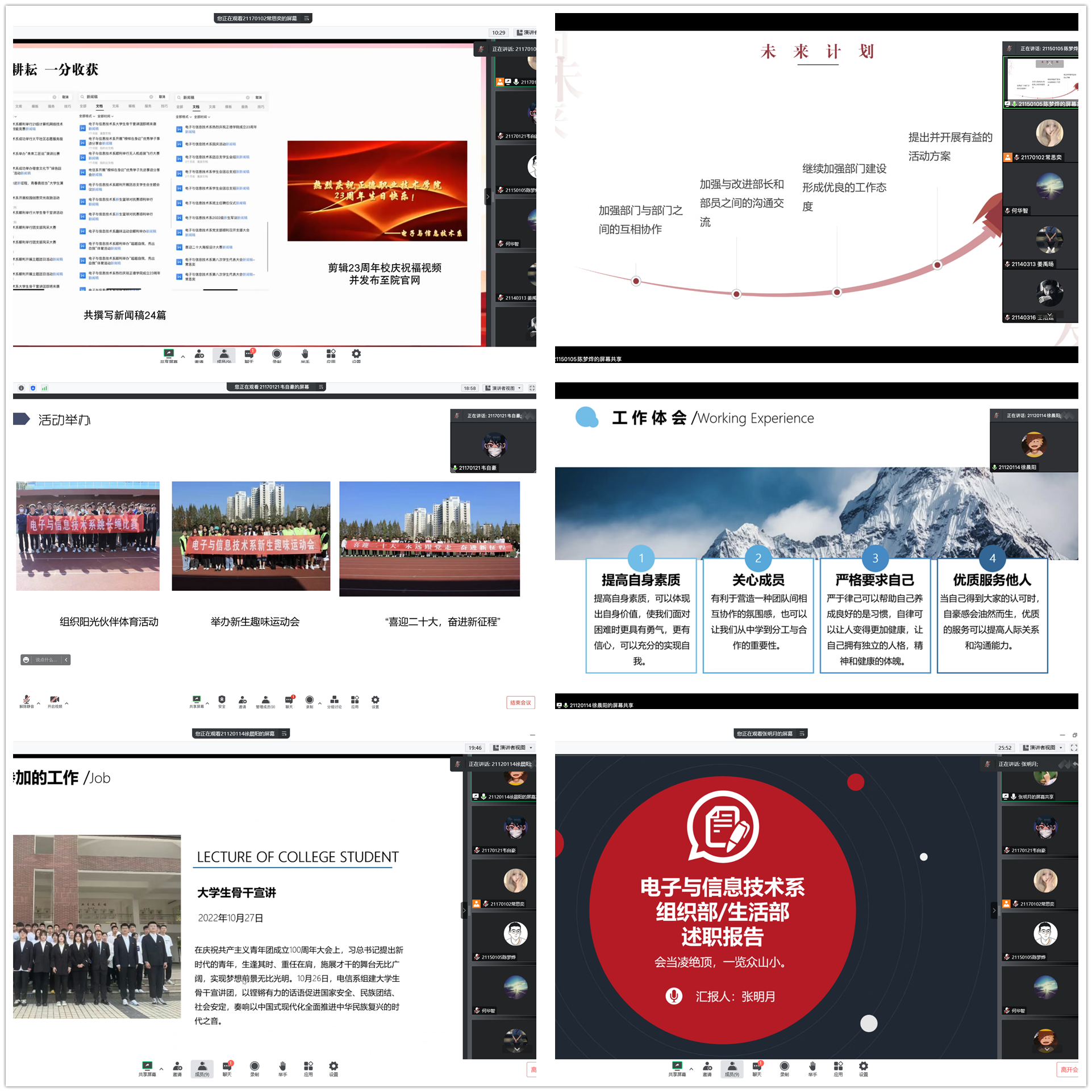 为了更好地总结2022年度电子与信息技术系团总支、学生会的各项工作,加强对团总支、学生会成员的管理,进一步促进团学工作的开展,电子与信息技术系于12月12日下午3时30分通过腾讯会议线上举办2022年度述职评议会,会议由系团总支书记何华智主持。