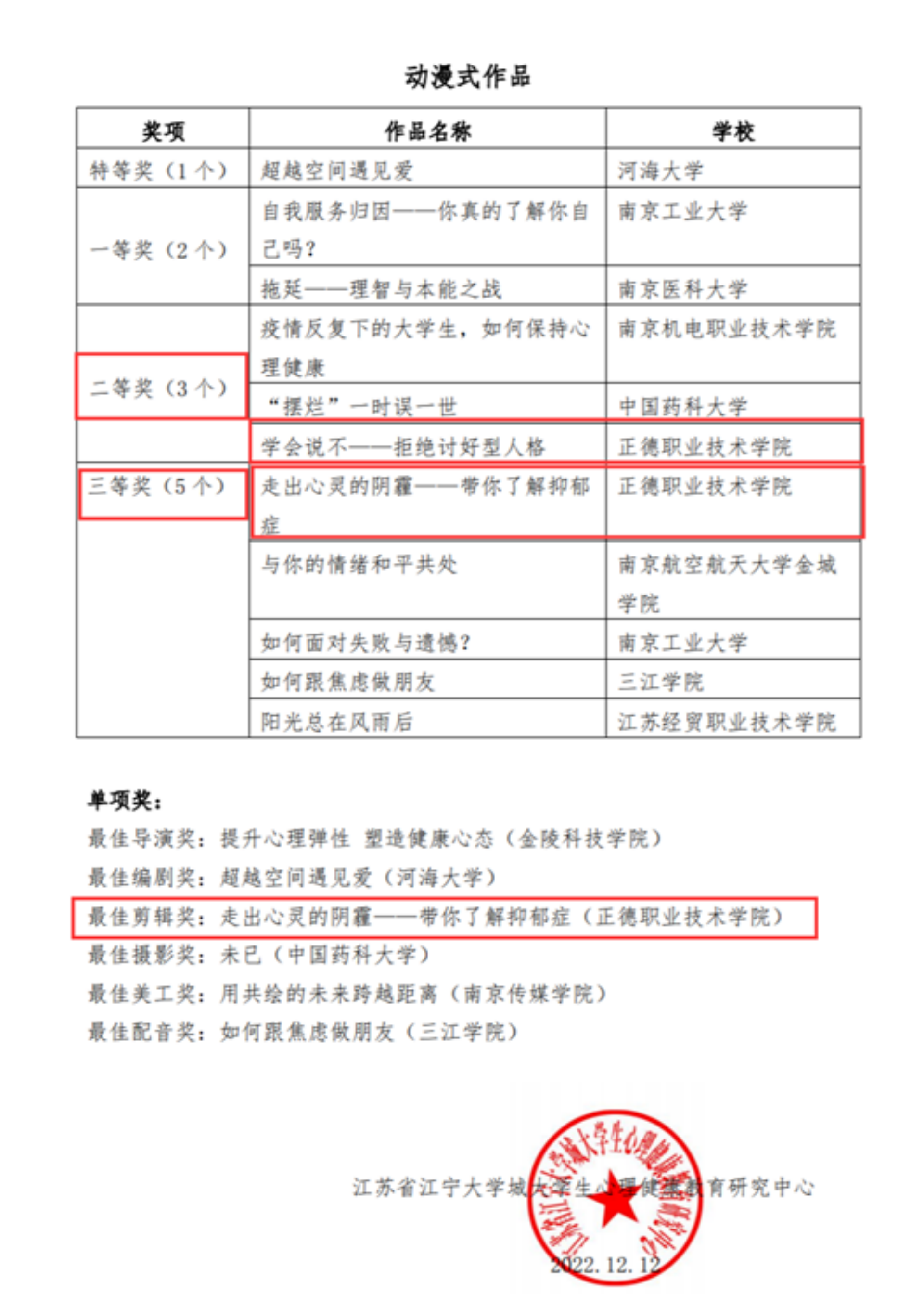 江宁大学城心理健康移动微课程比赛已连续开展六年,吸引了广大师生积极参加,在各高校友好交流的同时,创作产生了一系列生动趣致、寓教于乐、富有时代和青春气息的心理健康科普类短视频作品,应用于学校的心理健康宣传教育,促进了同学们对心理健康的关注和思考。户外露出 自江宁大学城举办微课大赛以来,共获一等奖2项、二等奖1项、三等奖1项。今后,户外露出 也将一如既往加强大学生心理健康教育建设,坚持“育人” “育心”相统一,激励同学们不断向阳携行,共创未来。